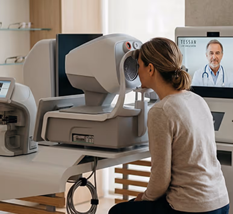 Rendez-vous dans une pharmacie partenaire Tessan. Installez-vous dans l'espace de consultation dédié. Le médecin vous examine à distance grâce à des médicaux connectés (thermomètre, dermatoscope, oxymètre, tensiomètre, stéthoscope, otoscope).